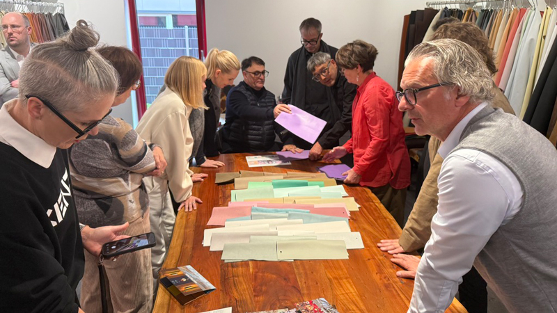 Perfekte Bedingungen für die Erstellung der ModEurop Colour Card Frühjahr/Sommer 2027 boten am Folgetag die Showrooms des auf hochwertige Leder spezialisierten Anbieters Jacobs in Eppertshausen. Inhaber Michael Jacobs ermöglichte den Teilnehmern spannende Einblicke hinter die Kulissen seines Unternehmens. Nach der Begrüßung durch den Geschäftsführer des Deutschen Schuhinstituts (DSI), Manfred Junkert, stellte ModEurop Präsident Karim Choukair die enormen Herausforderungen für die Branche heraus. Sein Credo: „In schwierigen Zeiten kann man nur mit Mut und Kreativität, also im Sinne von out of the box denkend gewinnen.“ Unverzichtbar, so der allgemeine Tenor, sei der Blick durch die Brille der Endverbraucher, um Menschen wieder für Mode zu begeistern.