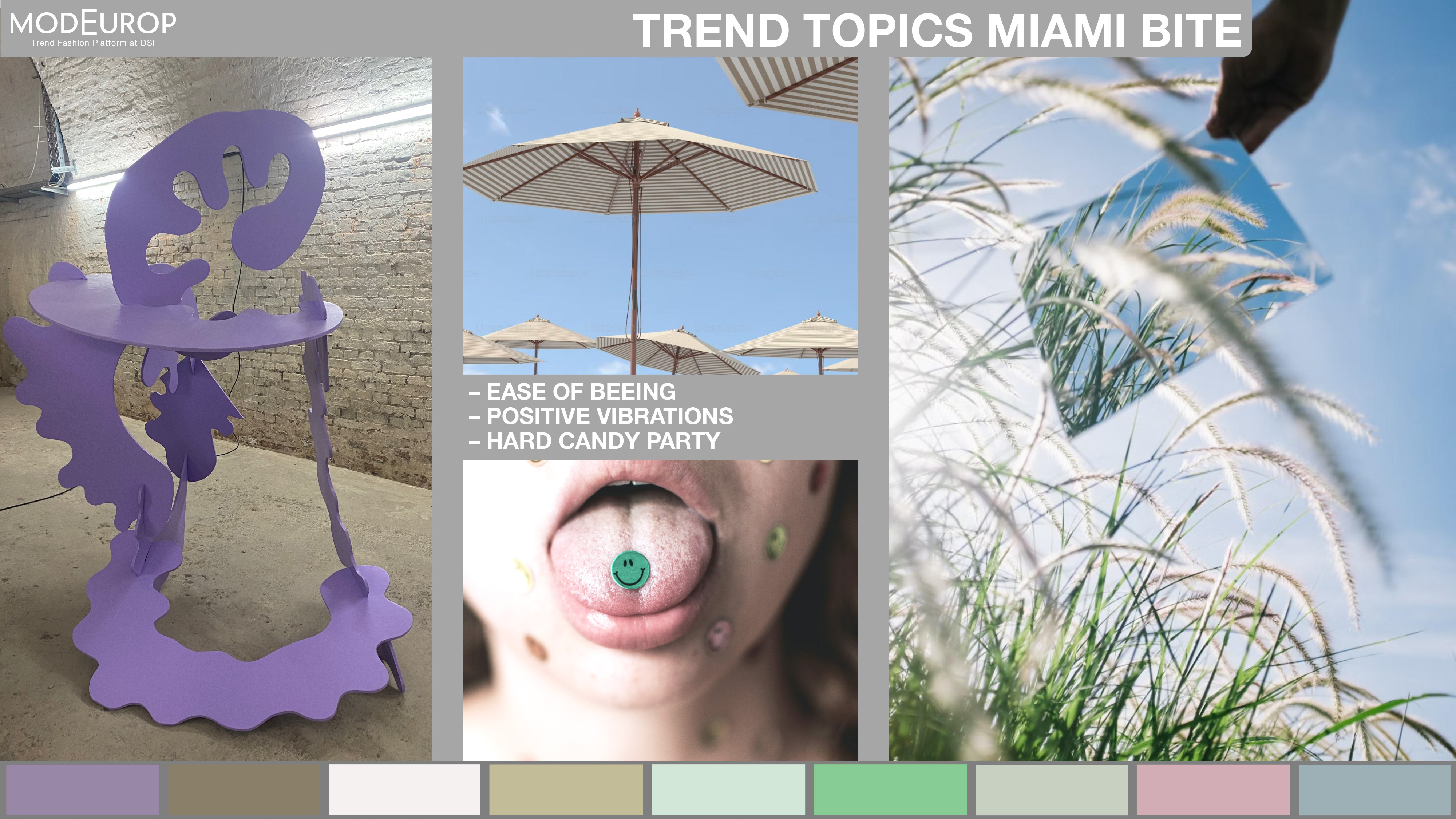 Eine Ode an die Leichtigkeit des Seins stellt das Thema MIAMI BITE dar. Das lichte Farbszenario schafft eine Balance zwischen Zartheit und Progressivität. Bei den Looks trifft Romantik auf Retroliebe, gepaart mit Dekonstruktivismus. Lingerie, Netz, Transparenz und verspielte Wickelelemente werden vielfältig re-interpretiert. Auch bei Schuhen und Taschen: Matt-Glanz-Effekte, Stanzungen und feminine Applikationen spiegeln den spielerischen Charakter dieses Themas wider.