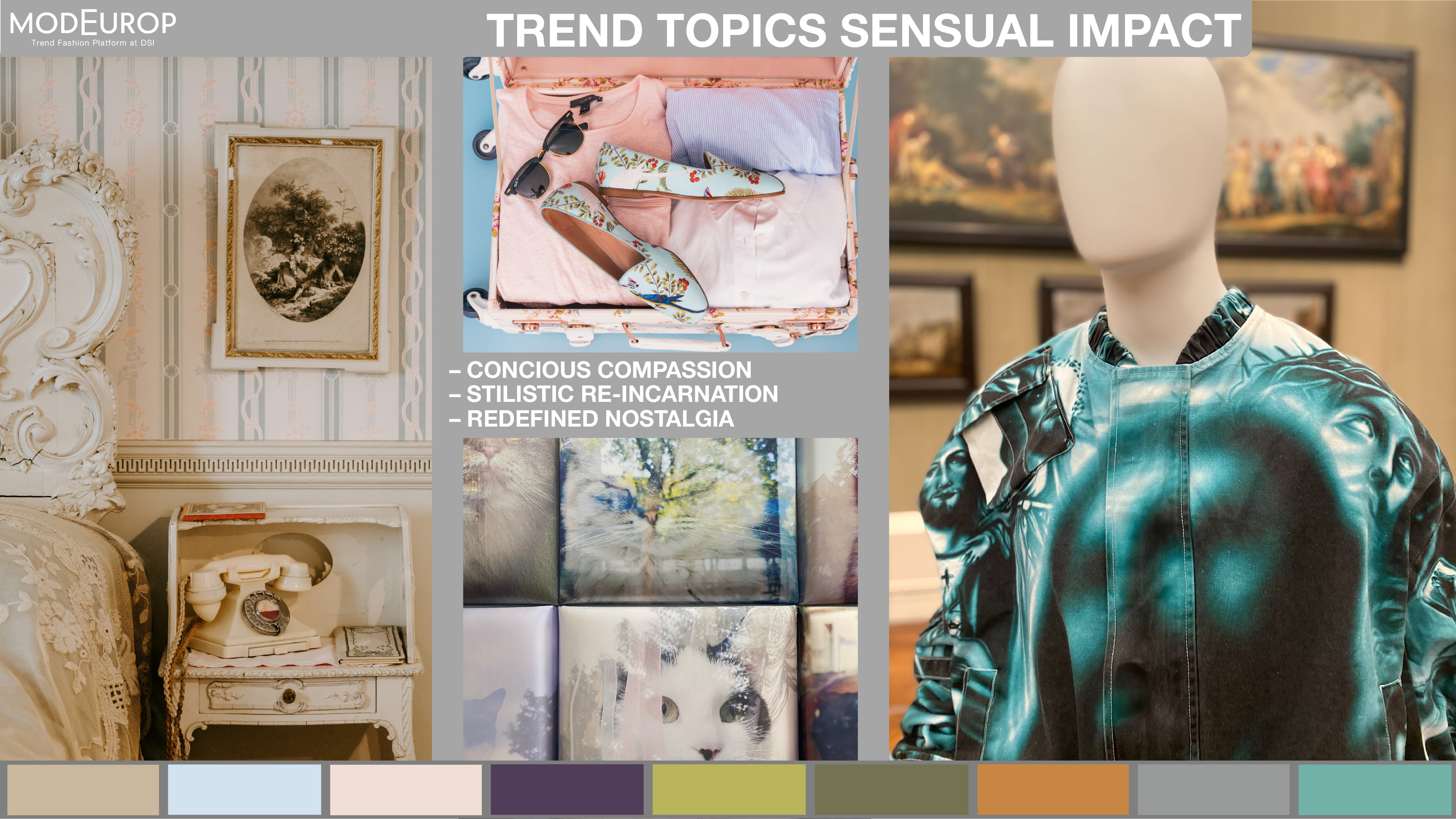 Tagträume sind beim Farbthema SENSUAL IMPACT ausdrücklich erwünscht. Die frühsommerliche Farbrange präsentiert sich nostalgisch und zeitgleich hypermodern. Romantische Verklärung und modern interpretierter Realismus vereinen sich zu einer neuen Ära. Die Looks zitieren längst vergangene Epochen (Korsagen) mit contemporary Aspekten aus dem Bereich Workwear. Anleihen, die sich auch bei Schuhen und Taschen wiederfinden: Federn, Fransen, Strass-Steine und Schleifen sorgen für Wow-Effekte.