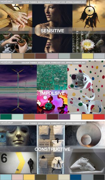 Diese Strömungen spiegeln sich in den drei von ModEurop festgelegten Farbthemen wider. Das Leitmotiv von SENSITIVE ist die Natur in den frühen Morgenstunden eines Sommertags am Meer. Zarte Pastells, neutrale Grautöne und dunkles Braun werden durch Sulphur zum Leuchten gebracht. Leicht unfertige, handwerkliche Optiken und Inspirationen aus der Botanik sind charakteristisch für die neuen Looks. Die Materialien zollen ebenfalls der Natur Respekt: Makramee- und Flechttechniken, viel Baumwolle, Sisal und Hanf aber auch Naturleder und Velours mit Vintage-Effekt. Grenzüberschreitung und modische Selbstbestimmung bestimmen das Thema IMPULSIVE. Verschiedenste Stilrichtungen von Madame-like über Disco Chic bis hin zu Dschungel-Inspirationen werden spielerisch zu neuen, unverbrauchten Konstellationen gemixt. Die Farbbotschaft ist intensiv und ultramodern. Acid Green, Virtual Violet, Synthetic Mint und Artificial Rose treffen auf eine sichere Basis von Red Light und Mandelbraun. Vielfalt auch bei den Materialien: Satin, Lack und Synthetics stehen Nubuk mit gummiertem Touch, metallischen Oberflächen und Canvas gegenüber. Eine neue Coolness mit Zukunftspotenzial prägt das dritte Thema CONSTRUCTIVE. Es zeigt dekonstruierte Silhouetten, reduzierte Linien und extreme oversized Shapes. Die Farbrange spiegelt die Moderne wider: kühl und schmeichelnd zugleich. Als Basis stehen tonig modifizierte Naturtöne bereit. Metallisches Grau sorgt für Coolness, Modernität entsteht durch die Zugabe von mattiert strahlendem Bulb Gelb und leuchtende Blautöne in unterschiedlichen Schattierungen. Nappa, glattpoliert oder narbenfrei, Metallics, Gummierungen und Pull-up Effekte setzen das Thema neben ultraleichten Hightech-Materialien materialistisch um.