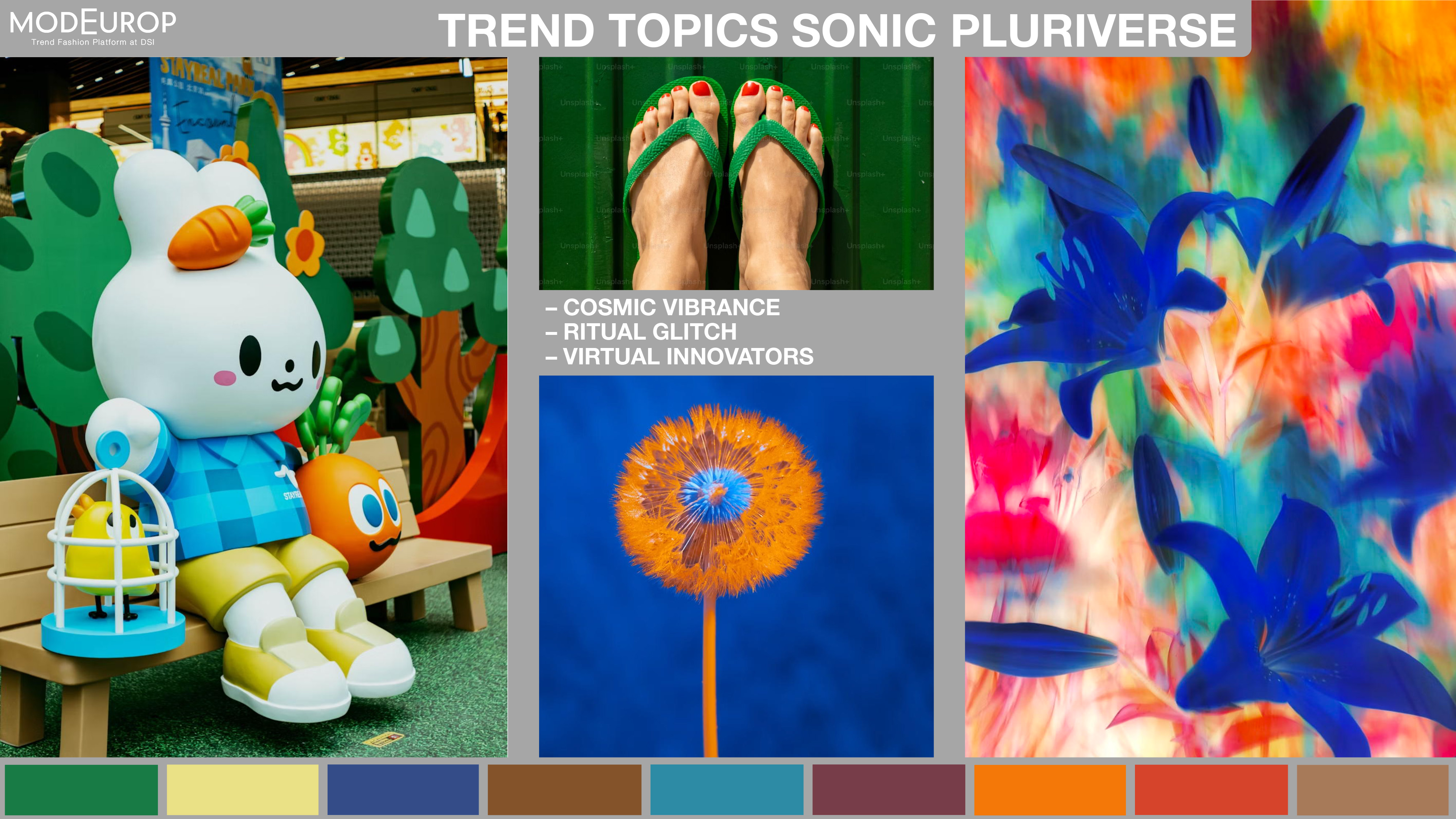 Die ModEurop Farbkarte für F/S 2027 greift diese Strömungen auf und definiert die drei Themen SONIC PLURIVERSE, MIAMI BITE und SENSUAL IMPACT.